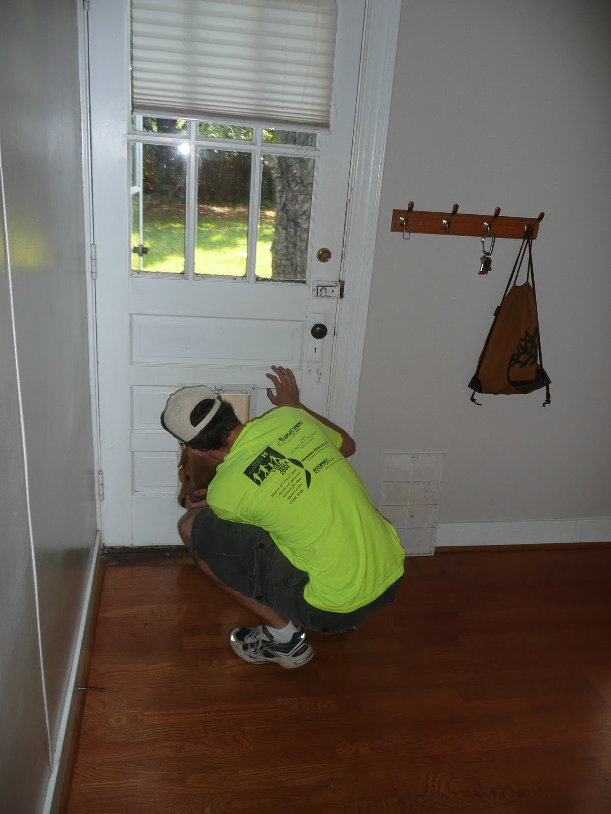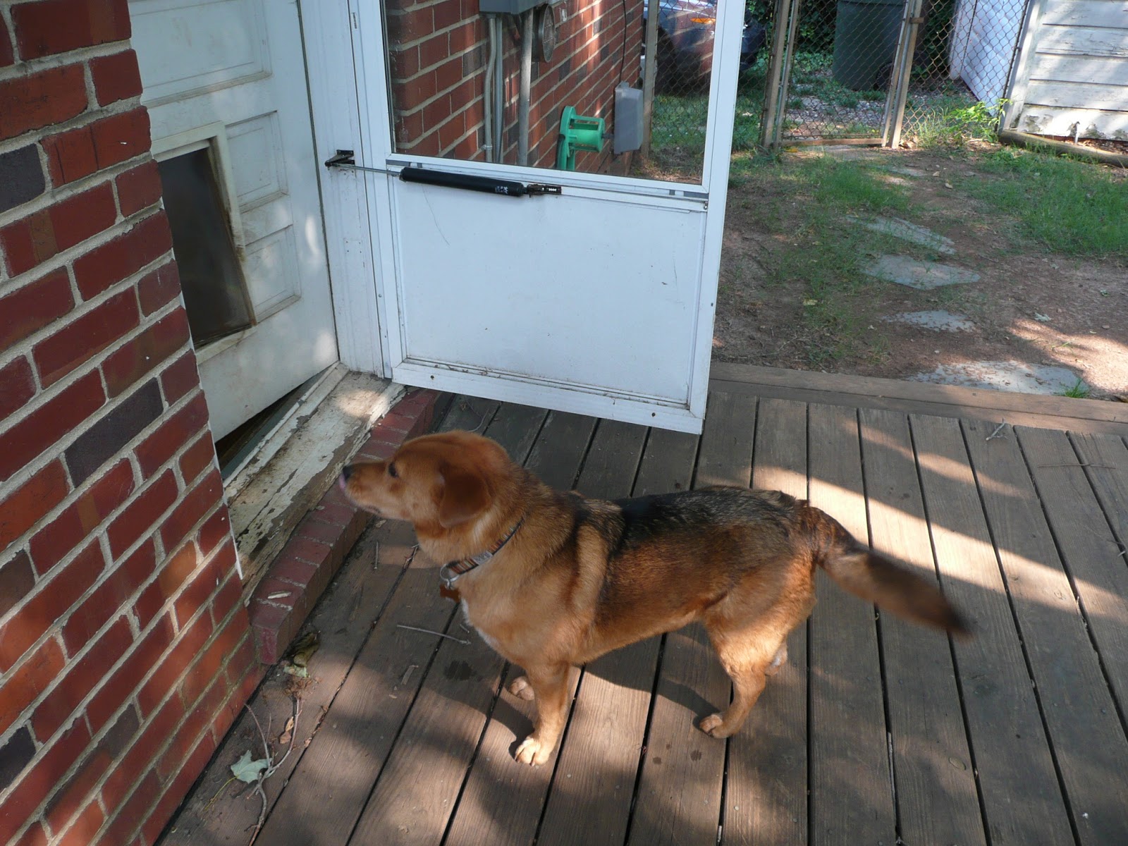 It is Brownie’s access to the backyard – thank goodness for dog doors! We quickly replaced this screen door with a newer one that also had a dog door. The previous owners just propped open the screen door – hence the thrashed threshold in this photo.