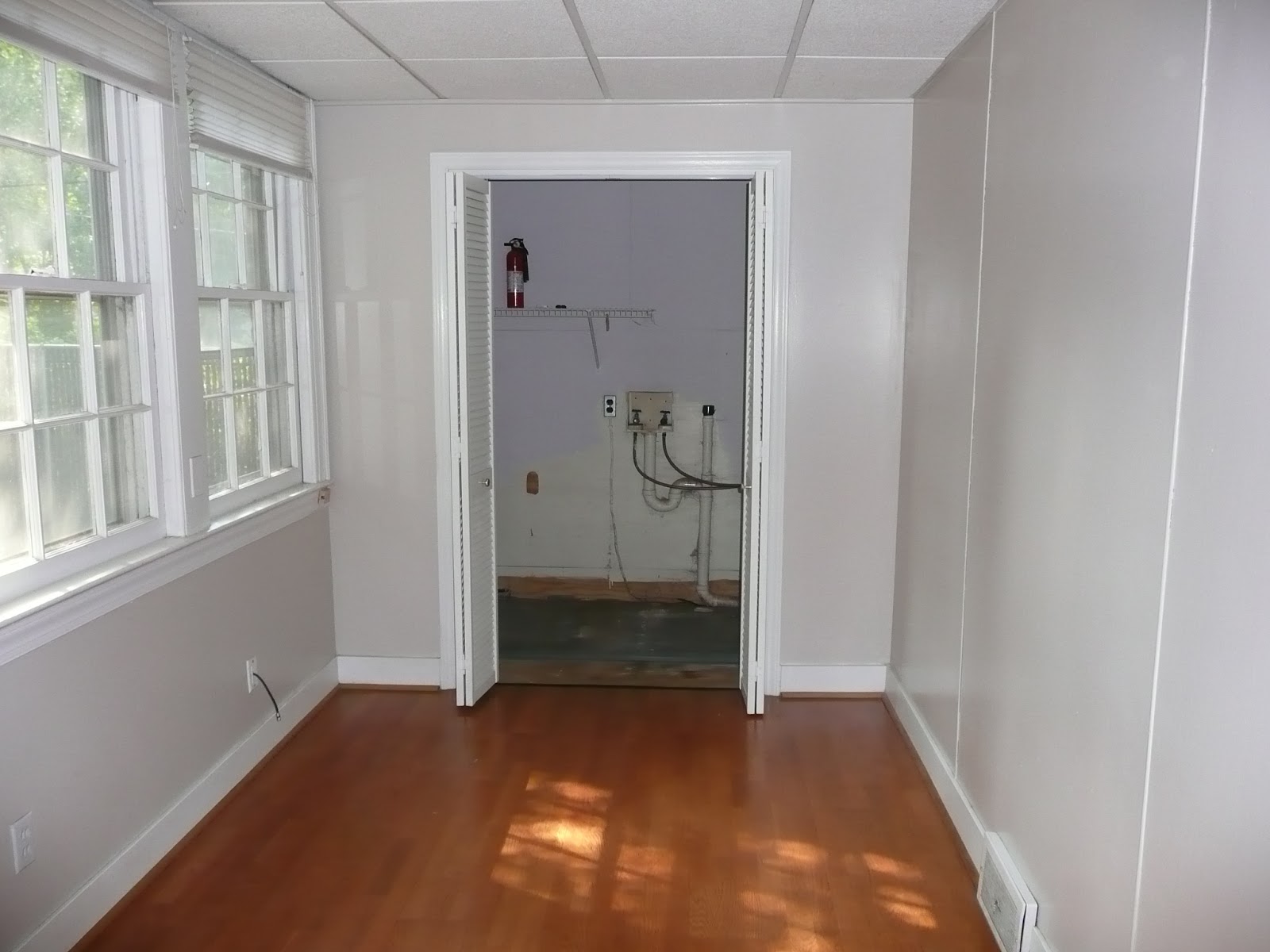 Our house has a back room that is truly a multi-purpose room. This is the room as it was when we bought our house in the summer of 2007. It is a narrow, long room that exits out to our deck in the backyard. From what we can tell, there used to be a doorway from Greta’s room into this room, the door would have been in the middle of the wall on the right side of this photo. A second chimney is above this closet shown here and there is still brick underneath the flooring of the closet. It makes me wonder if this room were a originally more of a porch.