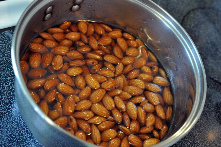 In a medium saucepan, combine 1 c. water, 1/2 c. maple syrup, 1/2 c. Scotch, and 3 c. almonds. Bring to a boil. Turn off heat and allow to soak for 30 minutes.