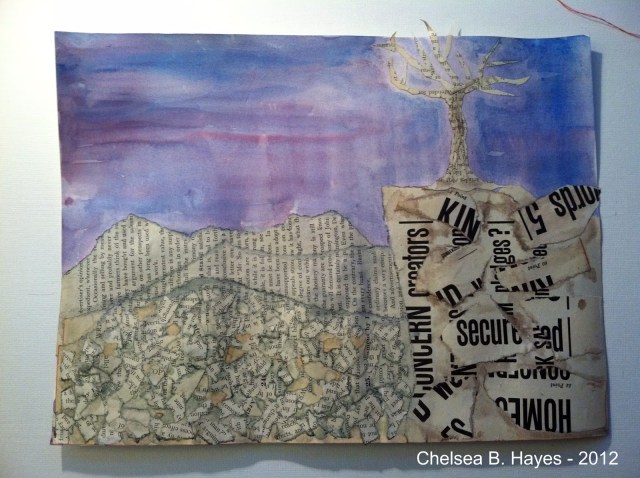 I forgot all about this collage & watercolor piece I had completed a while back – in November. Whoops! I made it on a friend’s birthday and subsequently ended up giving it to her . I have been really enjoying using the old books in my collage work lately.