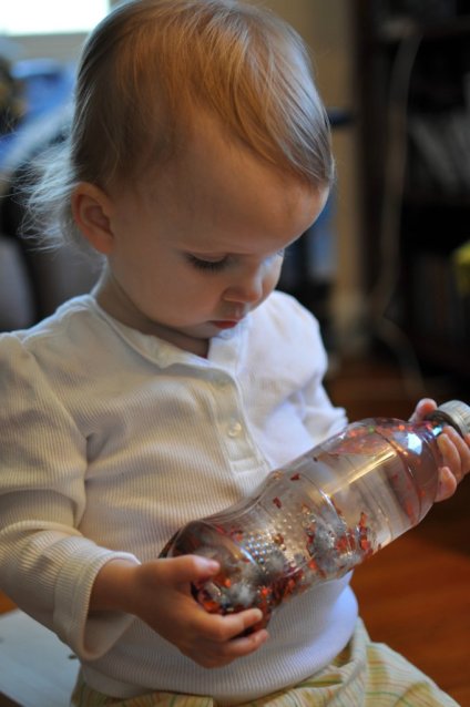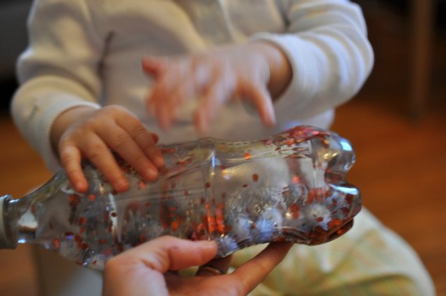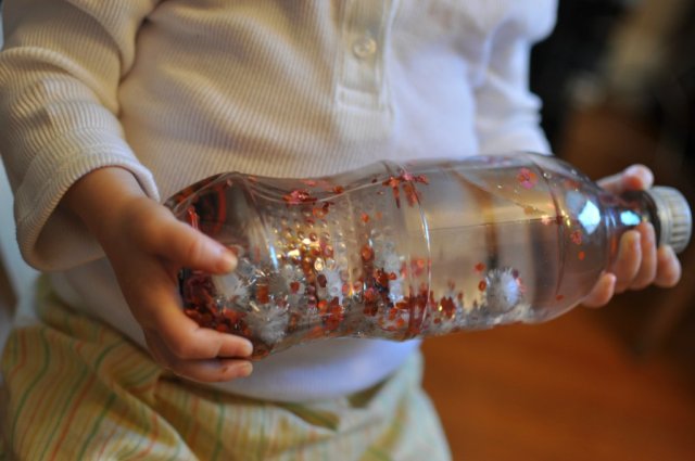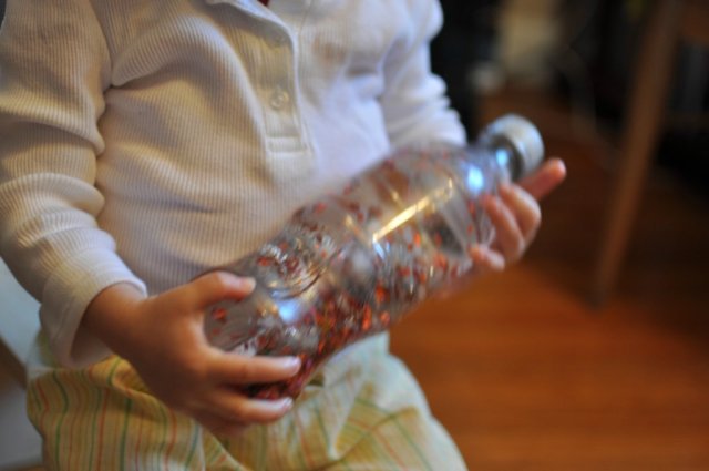 I put the glitter, poms, and confetti into a clean soda pop bottle and then filled it almost to the top with water. I made sure to leave some space at the top so that there would be a couple air bubbles. Then I glued the lid shut with Gorilla Glue, let it dry, and handed it over to Greta. Her initial reaction was of intense staring.