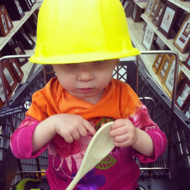 Greta was a big help in the store – clearly she figured out how to bargain shop – $.25 wooden spoon and $1 foam construction hat. Big spender!