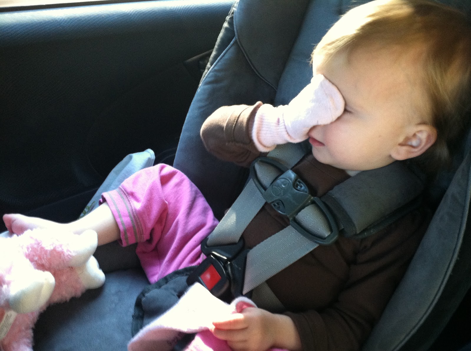 The trip takes a while but Greta was a sport – she did manage to figure out how to get her socks on her hands as means to entertain herself.