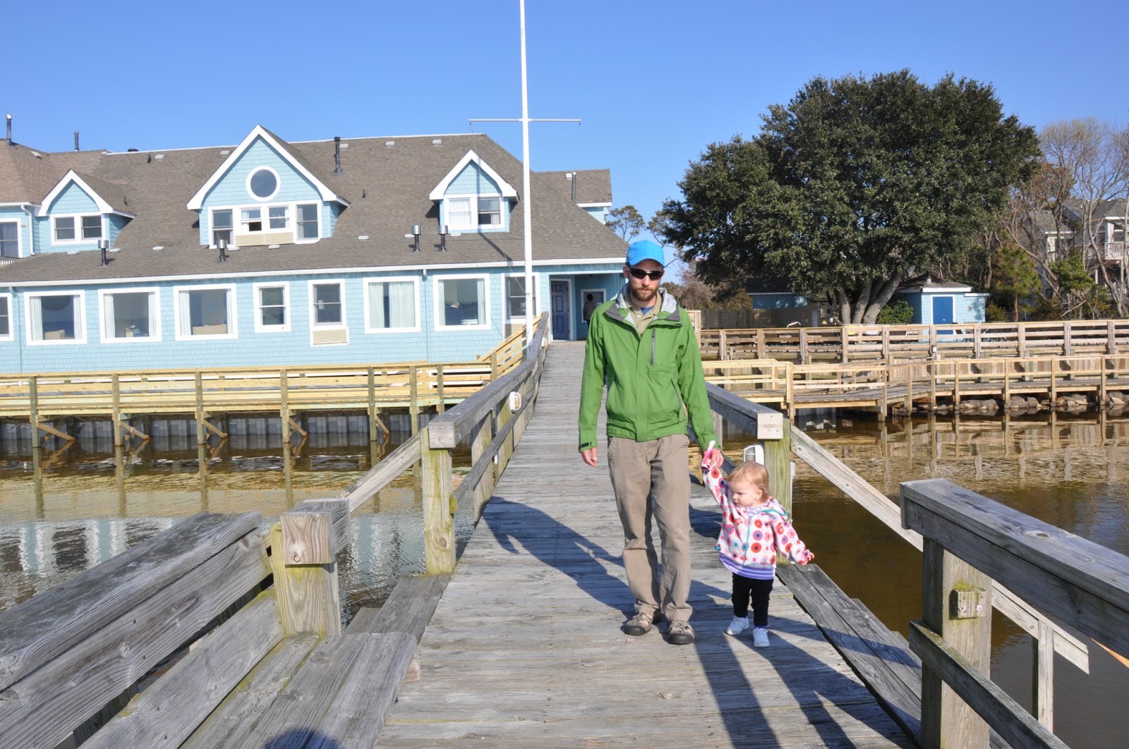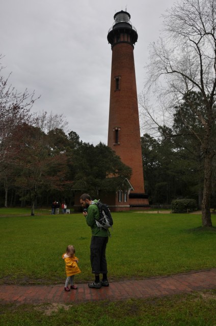 We spent some time at the beach the morning after we stayed in Ocracoke. Greta loved the sand, shells, birds, and dogs. She found a plastic rake on the beach and used it to stir up trouble. The highlight of the morning, for Greta, was when a helicopter flew over the beach close enough for us to see the passengers waving at us.