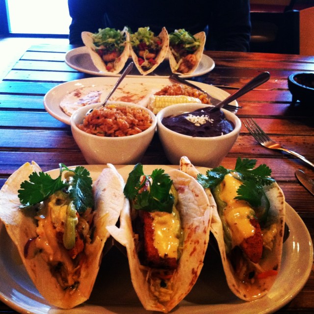 We ate dinner at the best Mexican food I have had in a long time at Agave Roja in Corolla. I have been hunting for something that even compares with the pescado tacos I had in the heart of Mexico City at a little stand years ago. I finally found them, on the NC coast – they were grilled with crunchy slaw, chile aioli sauce and guacamole. Eric ordered Camarones Tacos with pineapple-haberno sauce that were to die for as well. The black beans and rice were also fantastic. More to come on those in a future post.