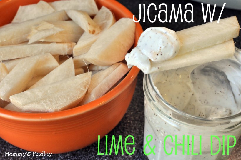 To make dip, combine: 1 cup of plain Greek yogurt, 1 tablespoon lime juice, and 1 tablespoon chili powder. Mix well and dip away! To store sliced jicama, be sure to put in covered, airtight container to prevent drying out.