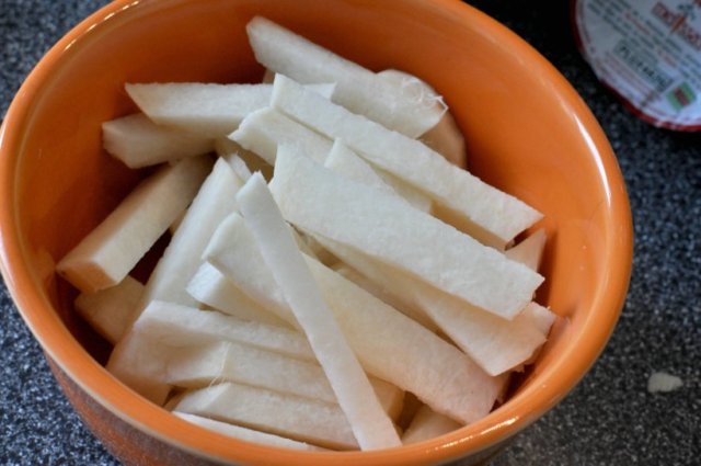 Slice jicama into wedges.