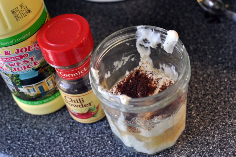 1. In a small bowl or jar, combine 1 cup plain Greek yogurt, 1 tablespoon lime juice, and 1 tablespoon chili powder. Mix well.