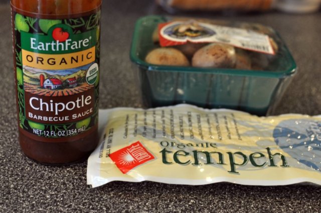 We have been loving Earth Fare’s chiptotle barbecue sauce lately – it is sweet and surprisingly warm. This combined with onion, mushrooms, and tempeh made for a perfect fast and filling pizza.
