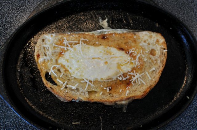 Preheat the pan and place bread on hot pan. Crack egg into hole in bread, cook 1-2 minutes per side, again depending on your preferences for eggs. Sprinkle with Parmesan cheese.