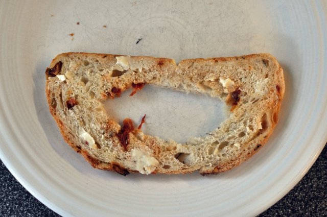 Sandwich #3 – Egg-in-a-Hole. Start with a solid bread – something with a nice crust and a chewy interior is best. We opted for dried tomato & cheddar from our favorite local bakery, Loaf. Cut a hole in the center of the bread and either butter up with a spread, or spray the pan with olive oil.
