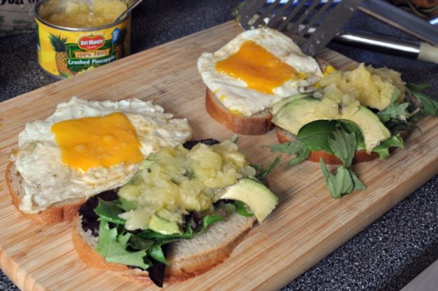 Fried egg sandwich #1 – Tropics Theme. Simply layer lettuce, slice avocado, and crushed pineapple on a slice of toasted bread. Then, place cooked egg and melted cheese on second slice of bread. Layer into a sandwich and enjoy.
