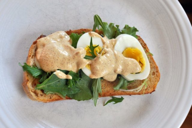 Toast wheat bread slices, layer with lettuce. Place sliced eggs on top of lettuce. Mix in a small bowl 1-2 tablespoons of mayo with 1-2 tablespoons of stone ground mustard and a few dashes of hot sauce. Spread mustard mixture over top of eggs.