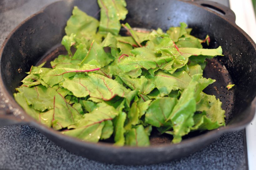 1. Remove beet tops from 3 beets, wash thoroughly. Slice the greens off of the red stem with a knife. Discard the woody red stems and chop greens down to smaller, more manageable bite-size pieces.