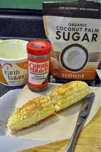 For the first ear, I used a smear of margarine, a sprinkling of coconut sugar, and Cajun seasoning.