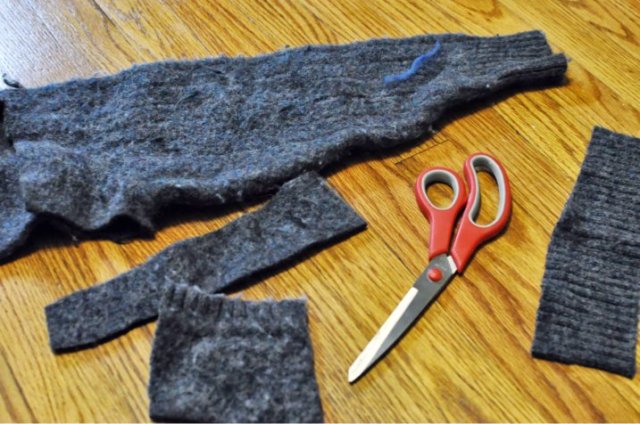 Start with felted wool sweaters. To felt sweaters, take 100% wool sweaters and wash them on hot and then dry them on hot. Cut felted sweaters into strips and rectangles.