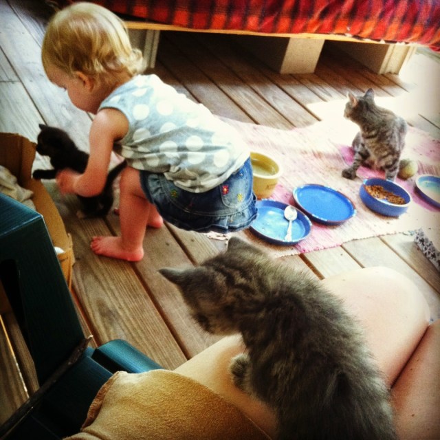 We have been helping to keep a friend’s feral cat’s kittens tame. There are six of these darlings and Greta is doing her best at keeping all the “ditties” in line.