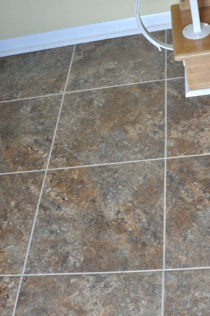 We opted for a slate look-alike and decided to put this down in the entryway, inside the coat closet, the downstairs bathroom, in the broom closet, and to the top of the basement stairs. This way, snowy boots could go straight to the closet or basement without depositing dirt and salt onto the wood floors.