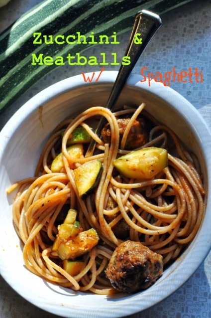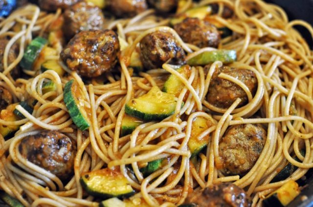1. Slice and quarter 2 medium zucchini. Saute zucchini in 2 tablespoons olive oil over medium heat until both sides are slightly browned. Add 8 – 10 oz of marinara sauce and meatballs of your choice. Simmer on low until thickened.