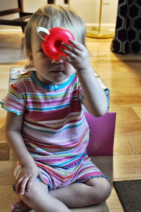 We also figured out that toddlers do not need toys – just everyday items. Take for example Scotch tape – the girl is much more dexterous with tape than I ever realized. These donut tape dispensers are excellent fun.