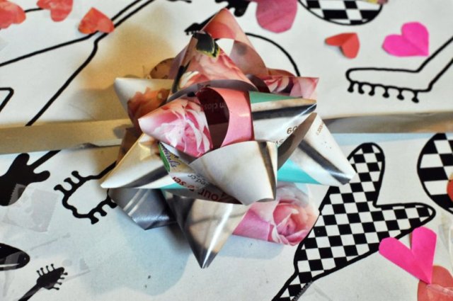 I did, however, have fun making a bow from magazine strips. This is one of those things I pinned off of Pinterest ages ago and am just now making use of it. Some things I just hate buying and would rather make or reuse – bows, wrapping paper, and cards are in that category. See this link for the how-to on making this bow.