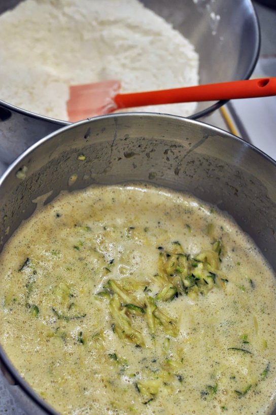 2. Shred 2 cups of zucchini and add to sugar mixture. Stir well.