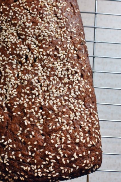 4. Make a well in dry ingredients, add wet ingredients and stir until blended. Grease and flour 2 loaf pans. Pour batter into pans. Sprinkle tops of loaves with ⅓ cup sesame seeds.