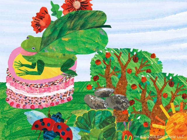 Lately, Greta’s been busy making digital artworks with The Very Hungry Caterpillar & Friends Sticker Book, which is based on the art and characters of Eric Carle. At $1.99 it is a deal! She made this illustration the other morning. The fun part about this app is the ability to choose objects and characters and stick them onto a background. There are 57 different stickers and 5 backgrounds to choose from. Greta loves the different sounds that accompany each sticker and loves to do silly things like place frogs on top of cakes.