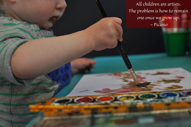 This is an older photo I took of Greta when we were back in Greensboro. The look on her face and the grip in her white little knuckles, made the determination palpable during this painting session. She has always loved to paint and manages to make the most beautiful abstract artworks that I wish I were able to create myself. How is it that children can make the most simply beautiful lines and smears of color, and yet, when I sit down with the intent to make an abstract image, I struggle? Too much pressure and knowledge, I think. I find myself referring to this Picasso quote more and more as I watch her grow, and as I have made the shift to teaching elementary art.