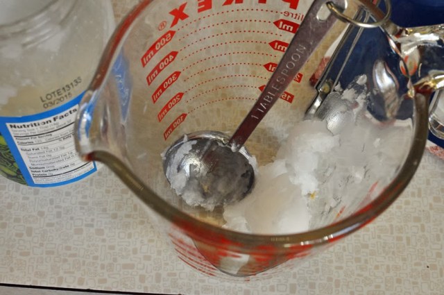 I swapped the normal cooking oil for two tablespoons of coconut oil. This heavenly smelling oil remains solid, if your house is cool, until you heat it up.