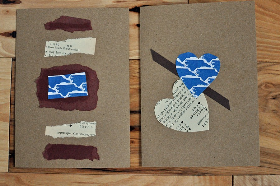 I’ve been working on more sewn paper cards this week. I added in some scrap booking paper, but I am still using old books and the interior print from envelopes – the blue North Carolina came from our old credit union’s mailed statements. That is one problem with being into collage – you save too many scraps. I have my scraps organized into file folders and in a plastic tub for easier access.