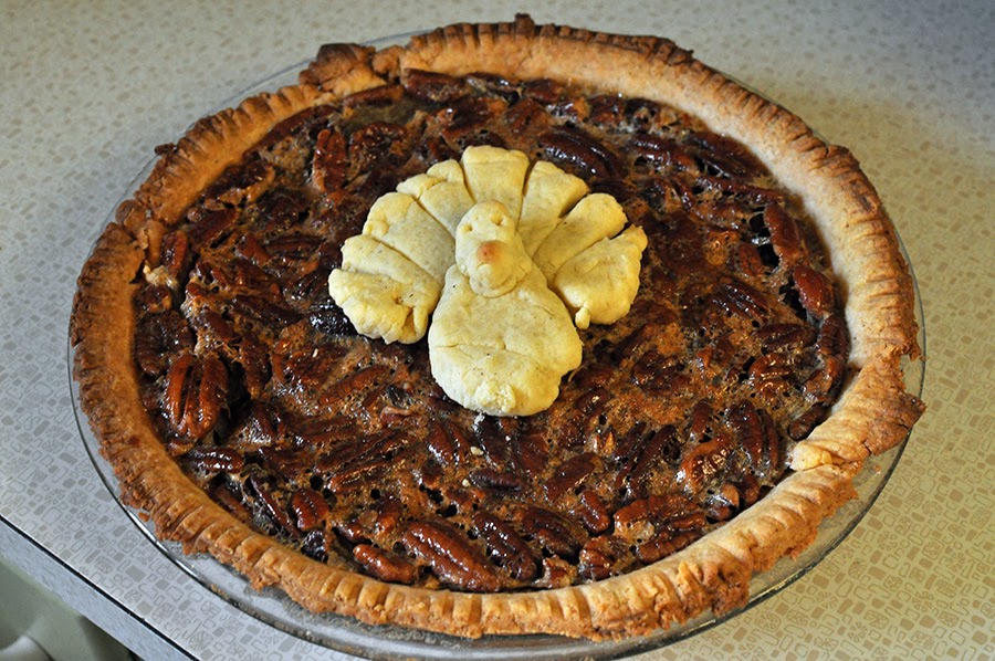 With the extra crust dough I made a turkey for the top of the pecan pie. I baked it in a separate baking sheet and simply added it on top of the pie when both were done baking and cooled.