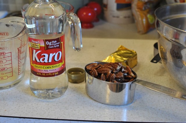 2. For filling combine: 3 slightly beaten eggs, 1 cup corn syrup, 2/3 cups sugar, 1/3 cup melted butter or margarine, and 1 teaspoon vanilla. Mix well, stir in 1-1/2 cup pecan halves.
