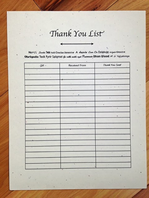 Every year at Christmas, I write down the gifts I receive in hopes of staying organized when it is time to write thank you cards. I inevitably lose my list at least a couple times. This year, I am trying a new approach with a list printed on nice card stock. I plan on making a few copies to disperse to family members who wish to use them as well.