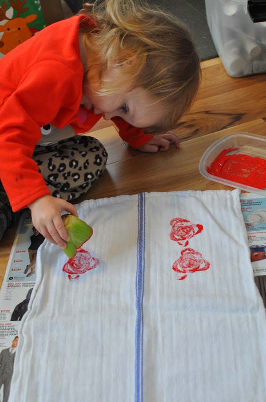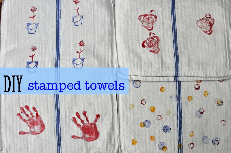 One recent sunny Saturday morning before Christmas, Greta helped me make these stamped towels. With minimal prep and basic supply list, they are an easy morning or afternoon project for all ages.