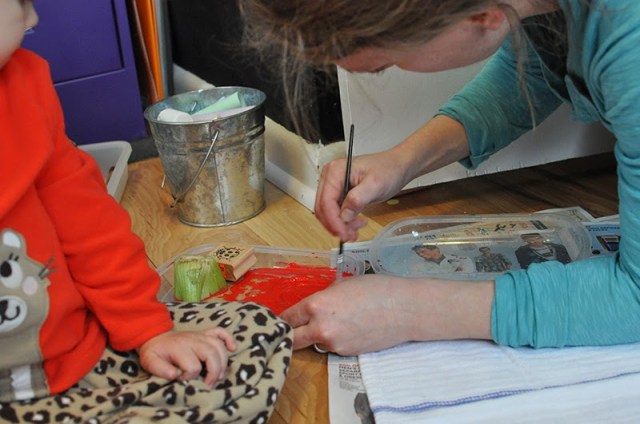 – rubber stamps, found objects, cut celery, cut apples, cut potatoes for stamping