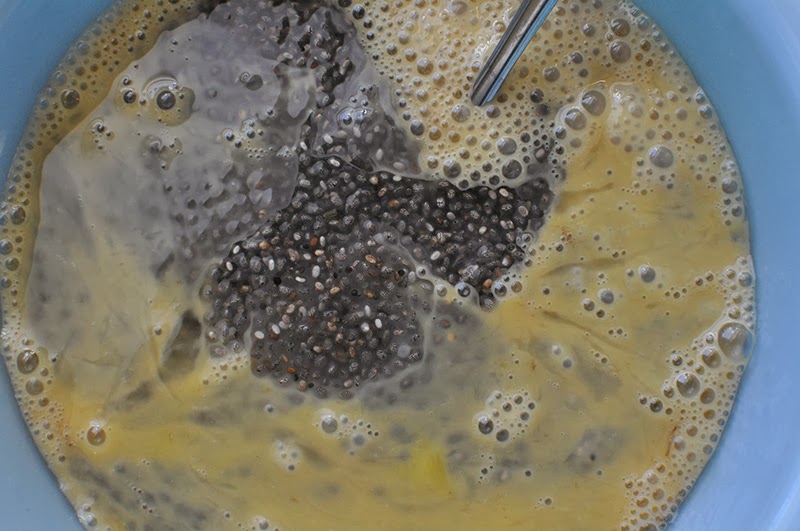 3. In a medium mixing bowl combine: 4 eggs, 2 teaspoons vanilla, and the chia seed and water mixture.