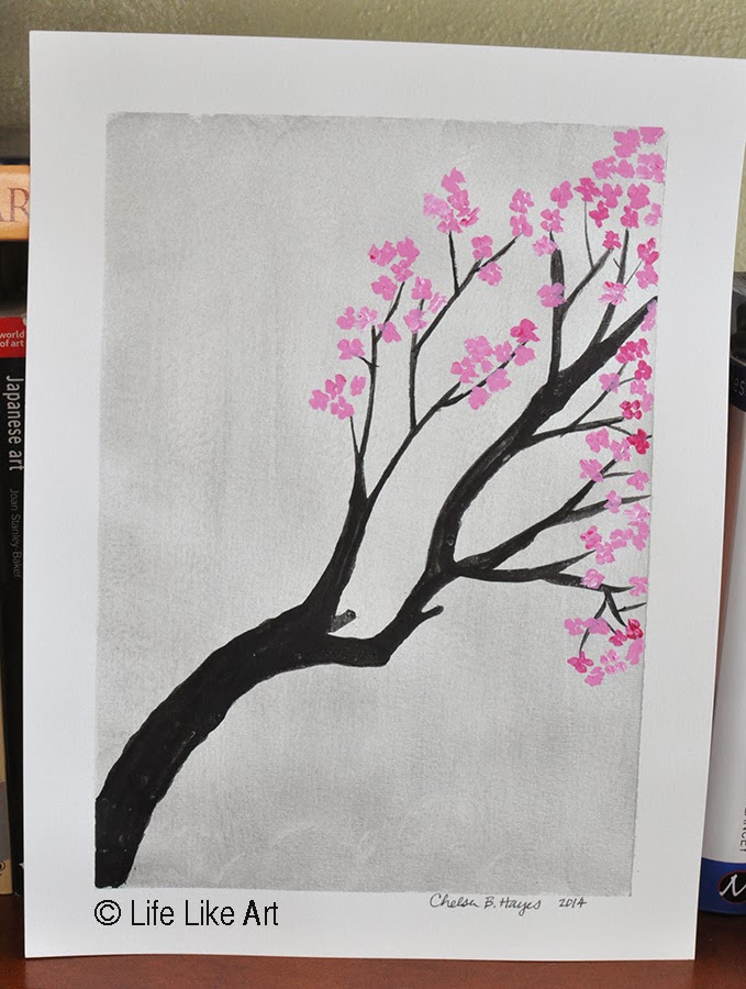 This painting is for a coworker who is having a girl any day now. She is going with silver, gray, and pink in the nursery. I stuck with a simple silver background, a stark black branch from ink, and bright pink cherry blossoms.