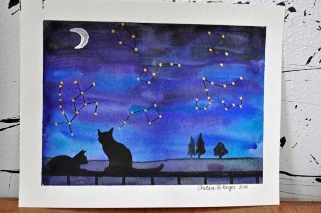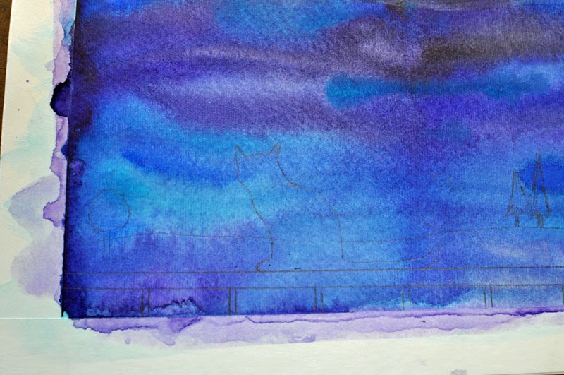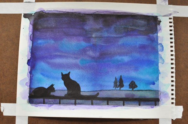 I started with a simple watercolor wash for the background. When it was dry, I added the pencil outline of the cats, railing, horizon line, and trees.