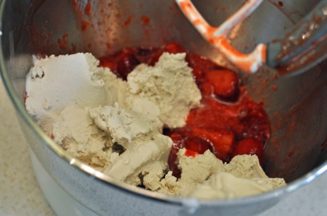 Allow the coconut ice cream to soften slightly and then beat together with thawed strawberries and raspberries.