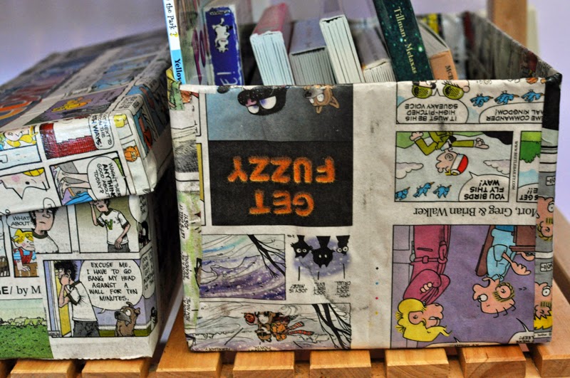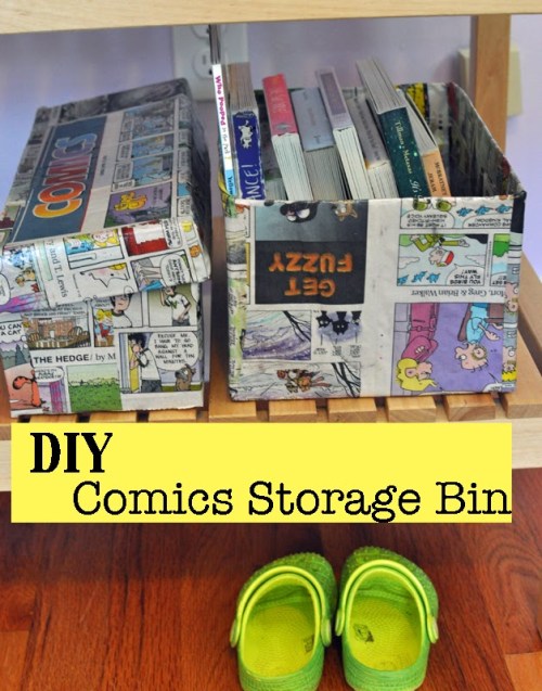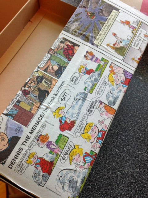 The finished product was a hit with my toddler – she loves to read the comics, or coupons as she calls them. Who knows why? They are now being used to corral her favorite bedtime books and doll clothing in her room. More on her finished big girl room later.
