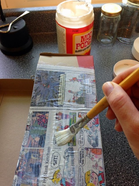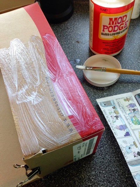 4. Brush Mod Podge over the area you are planning on covering first (about the size of the paper you just cut). I worked on one side at a time so that the Mod Podge would not glue too quickly. That paperclip, seen above, is holding a flap down, since one side was coming loose.