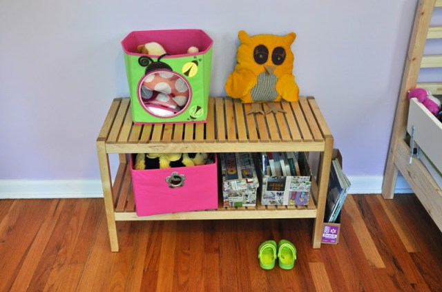 Her collection of favorite stuffed animals, doll clothing, and favorite bedtime books are all housed in bins and crates on this bench. It can also double as a nightstand when she eventually understands that concept.