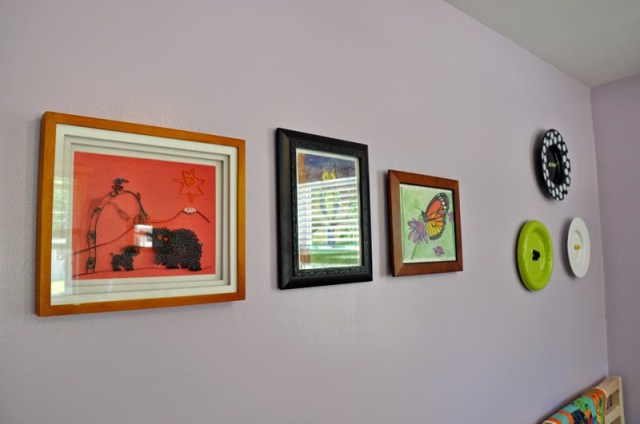 The butterfly and owl watercolors work well with the violet fog color. My mom made Greta the elephant artwork (left) with a technique called quilling.