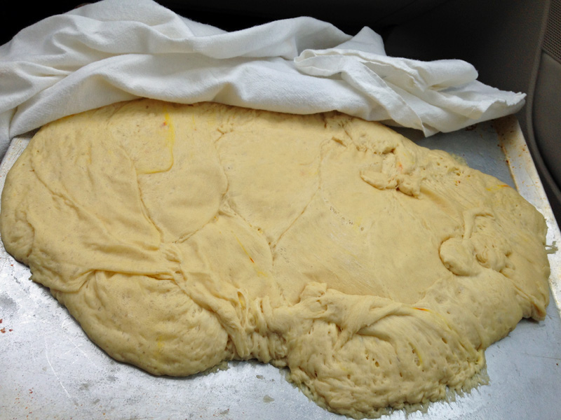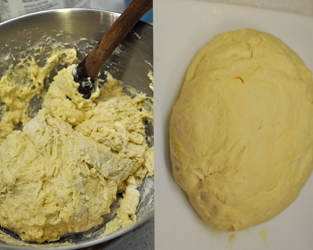 The coloring of this bread comes from the use of eggs in the recipe, hence its other name, egg bread. However, the flavor comes from an exquisite spice known as Saffron. I never use the powdered form, only the stigma from the crocus plant that makes this the most valuable spice in the world. I use a pinch and soak it in the warm water before adding it into the rest of the liquid mixture, just before mixing up the dough.