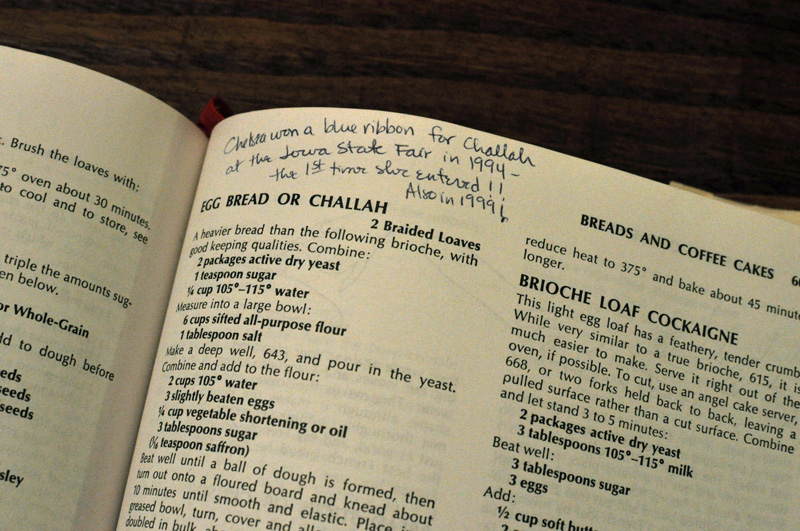 My love of yeast bread started with Challah. I don’t remember what prompted me to start baking Challah the first time, or how old I was the first time I made it. In my younger years, I entered it twice in the Iowa State Fair, winning a blue ribbon each time (preview of what’s to come, NO blue ribbon for this batch). Typically, I make Challah around Christmas time, and serve it warm with a mixture of honey and butter as a topping. I have also been known to make Challah for special occasions such as family gatherings and friends’ birthdays. I always use the Joy of Cooking’s recipe from my 1975 edition, the one with the handwritten note about my successes from my mother. I will walk you through the steps to making Challah and do my best to explain the tricks I have discovered over the years, however, I will warn you, my batch this year was a flop. This is no picture-perfect outcome post, but an oh, well, better luck next time.