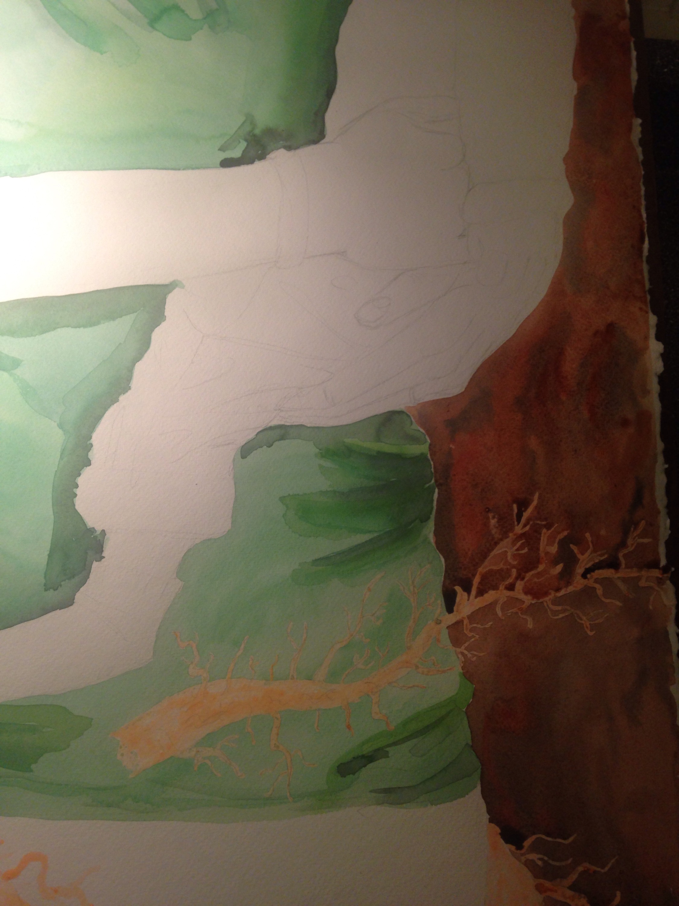 I have been working on it since March, slowly plugging away on it whenever I carve out the time. In other words, after children are in bed. The downside of a long-term watercolor is letting the orange frisket masking fluid sit for far too long on the paper. I have a few orange tinged root sections, as a result.