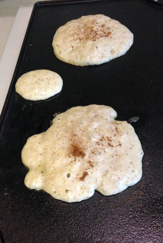 Next, I poured about a 1/2 cup of batter on top of the caramelized slices and sprinkled some cinnamon on top. I let it cook for 2-3 minutes, or till the edges were starting to dry and bubbles appear on the surface of the pancake, but don’t yet break. Check for doneness by gently lifting the edge of the pancake with a spatula.