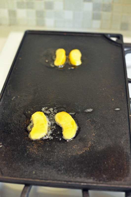 Then, I placed tabs of butter on the hot cast iron griddle, and cooked the thin slices of nectarine for a few minutes on medium heat, until they were softened and the butter was bubbly brown and caramelized. This griddle is a must-have in my kitchen – we bought our two-burner cast iron griddle a few years back and use it pretty much every day for breakfast.