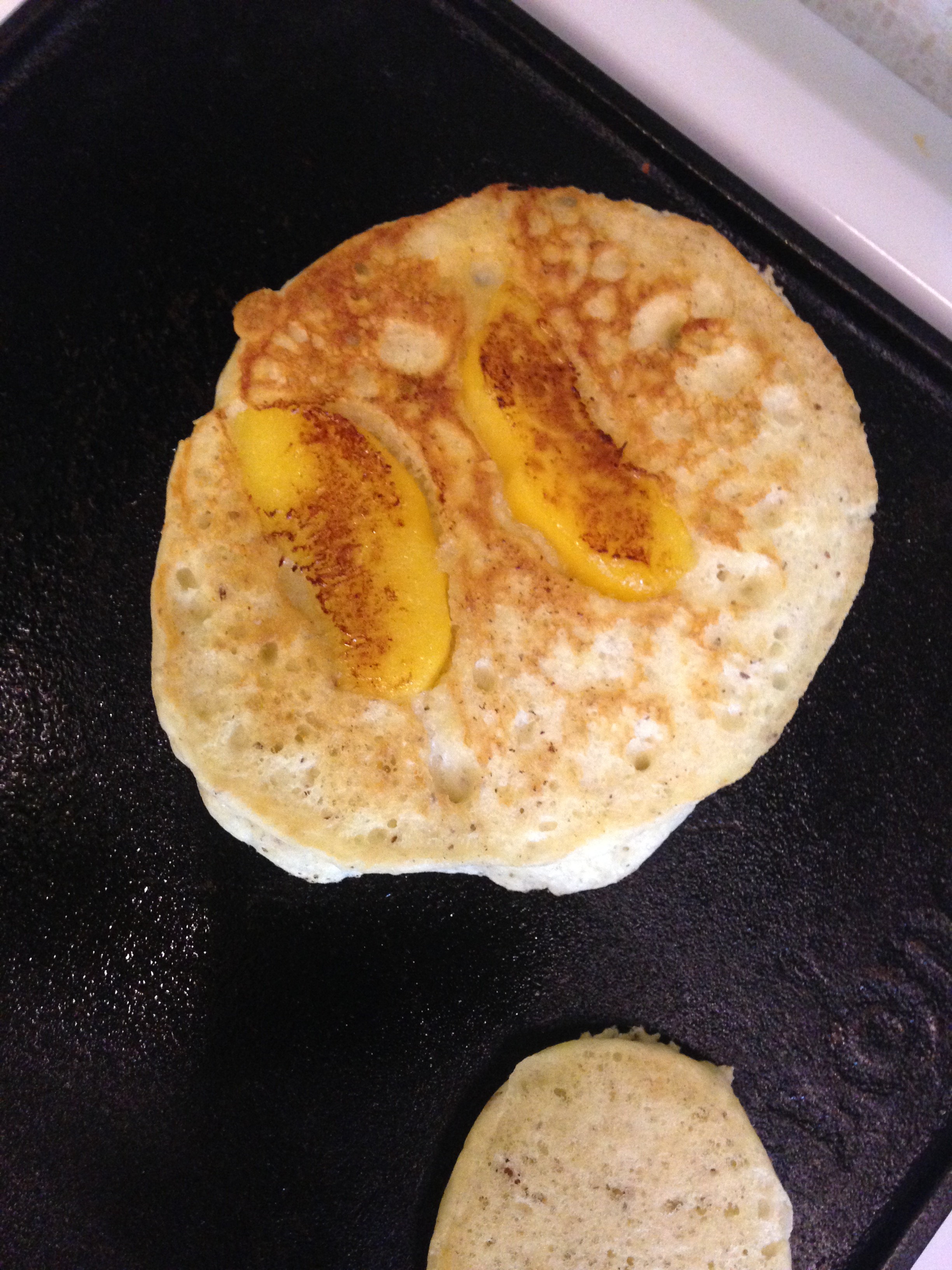 Nectarine perfection when flipped! I cooked the pancakes for 1-2 more minutes on the other side, check though, as the other side never takes as long to cook as the first. That little plain guy is for my youngest – he was happier to eat his foods separated. Check below for the base recipe of this easy, yet decadent pancake recipe. Note: I used all-purpose flour instead of cake flour. I never have that specialty flour around.